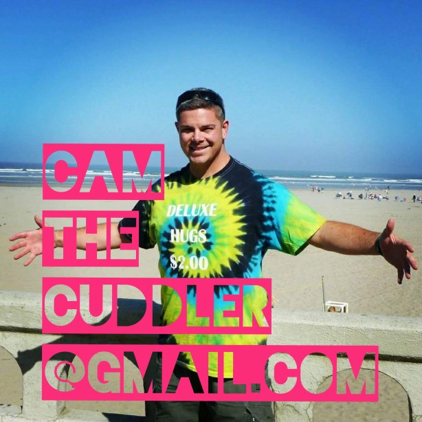 ON AIR you should see me (Cam The Cuddler) hugging people and chatting about my life as a certified professional cuddler. Check out his CuddleLife Blog for more information and to read my FAQs. I offer a platonic touch service, and I’m open to trades and donations. Typically I get one dollar per minute to care for people. I believe cuddling is therapeutic, and a fun and safe way to get the positive human touch we all need to survive.